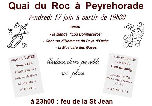 Pour la 30e édition de la fête de la musique, nous nous réunirons avec un peu d'avance sur le Quai du Roc, pour un récital offert par la ville et les associations musicales de Peyrehorade. Venez nombreux participer à cette fête et encourager les musiciens pour vivre un moment de plaisir partagé.